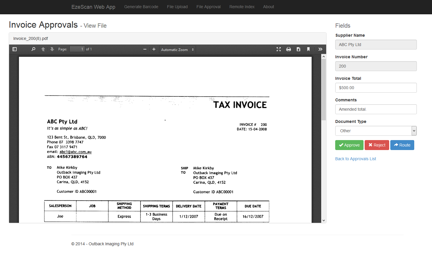 The EzeScan File Approvals Assistant (FAA) provides a web based approval/validation processing interface for documents such as invoices requiring approval for payment. Users receiving email notification of documents requiring attention can review documents in a standard browser on any device (including smart phones or tablets), validate, add or change metadata.